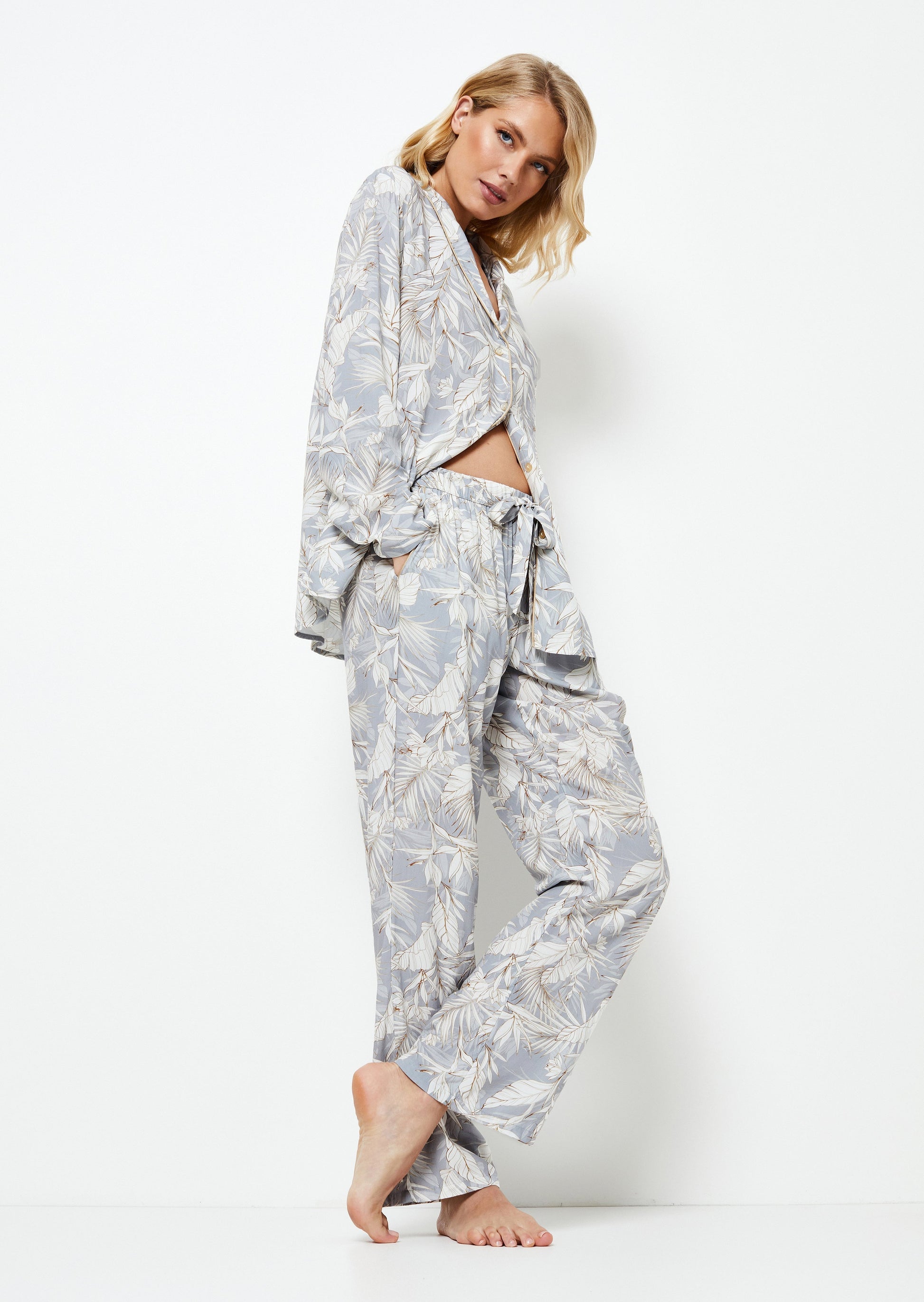 - Women's pajama pants set with a white and brown floral print on a light gray background.