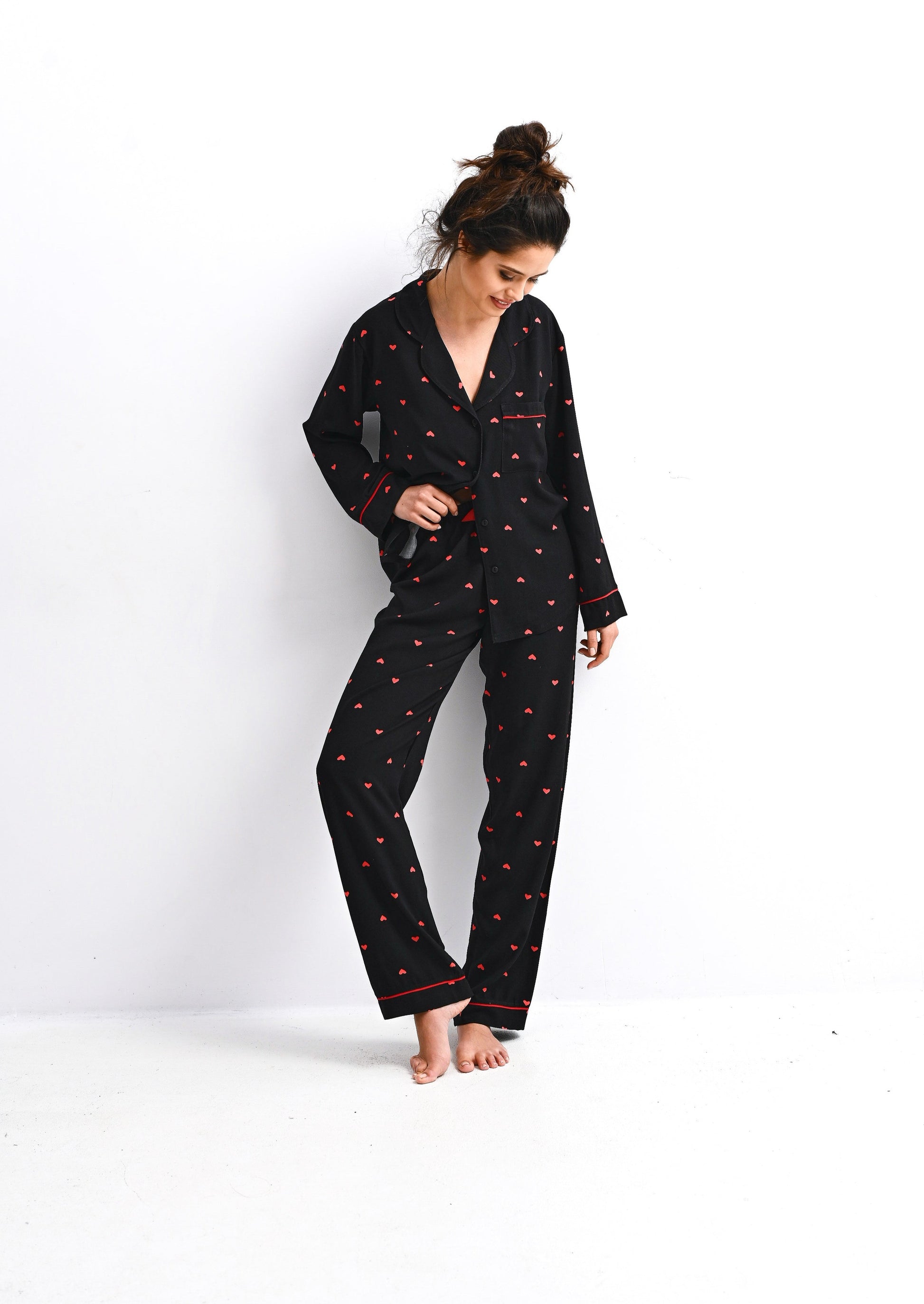 - Black pajamas set, 100% viscose, decorated with red heart patterns.