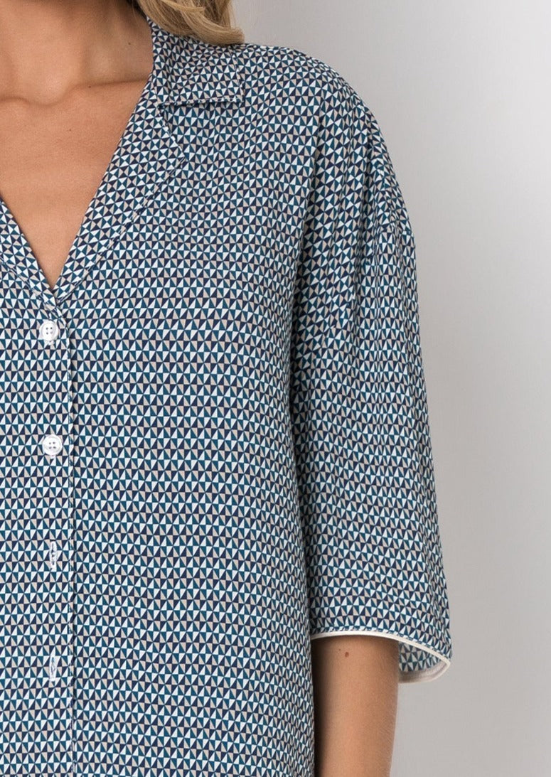 - Ensemble pyjama short femme à imprimé géométrique bleu nuit, bleu canard, beige et écru